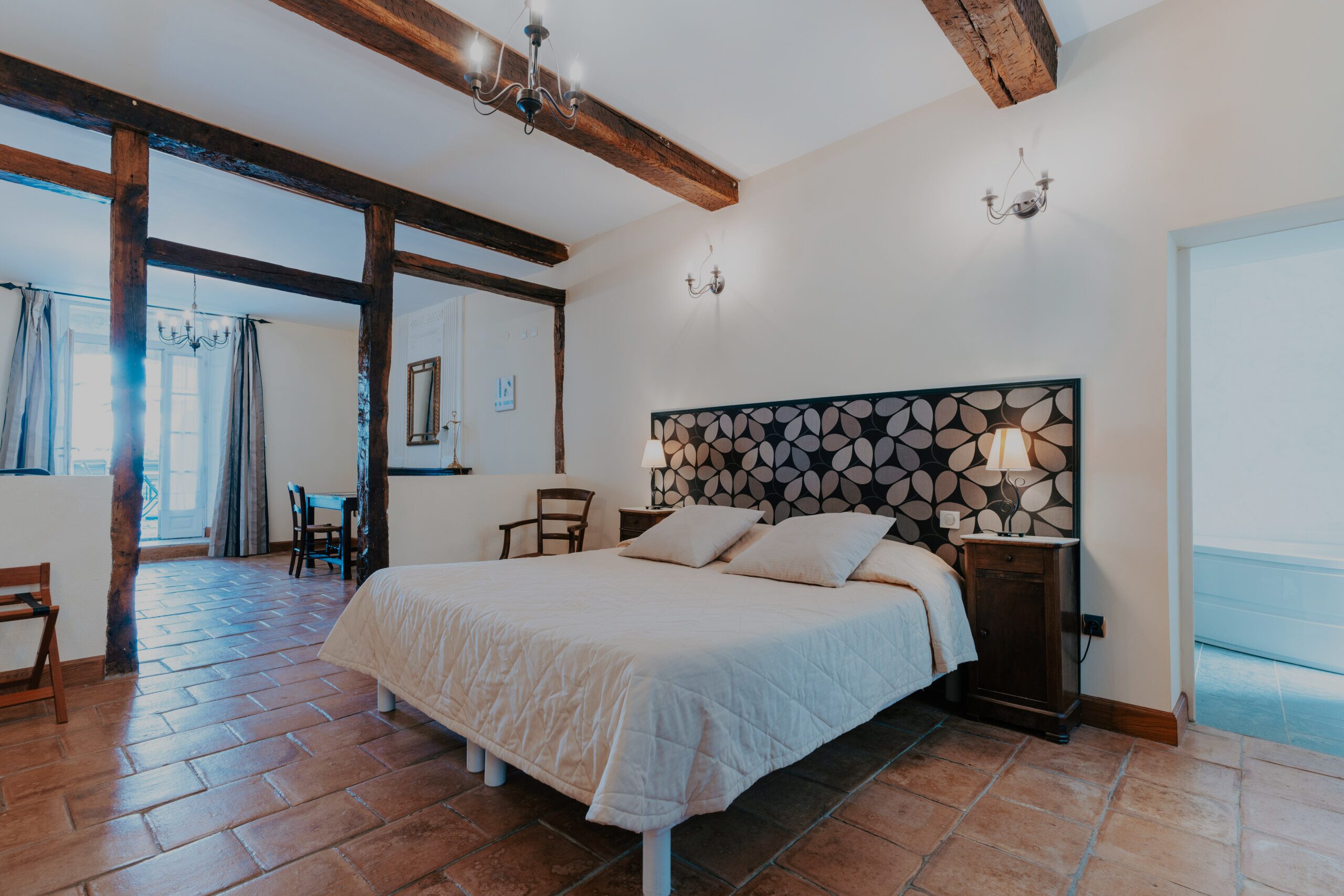 • – Chambre d’ environ 30 à 45 m² équipée de salle de bain avec baignoire balnéo ou douche à jets et wc séparé